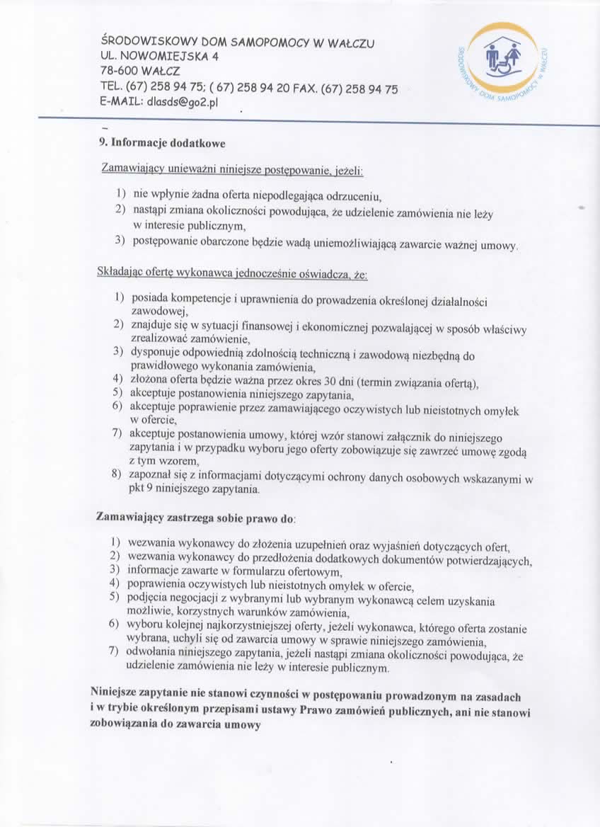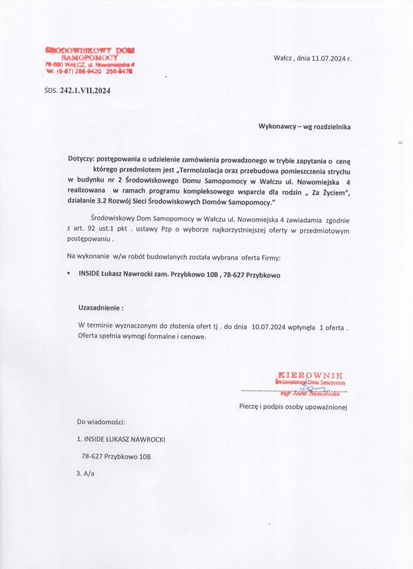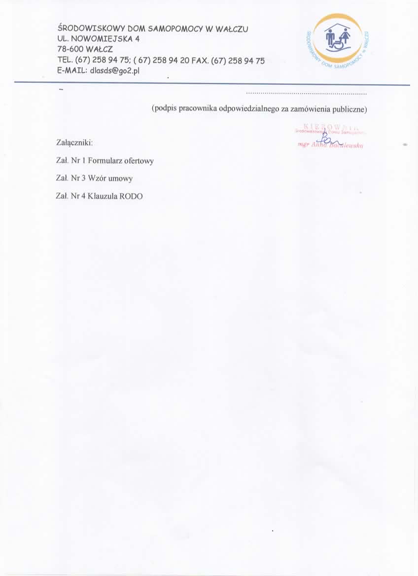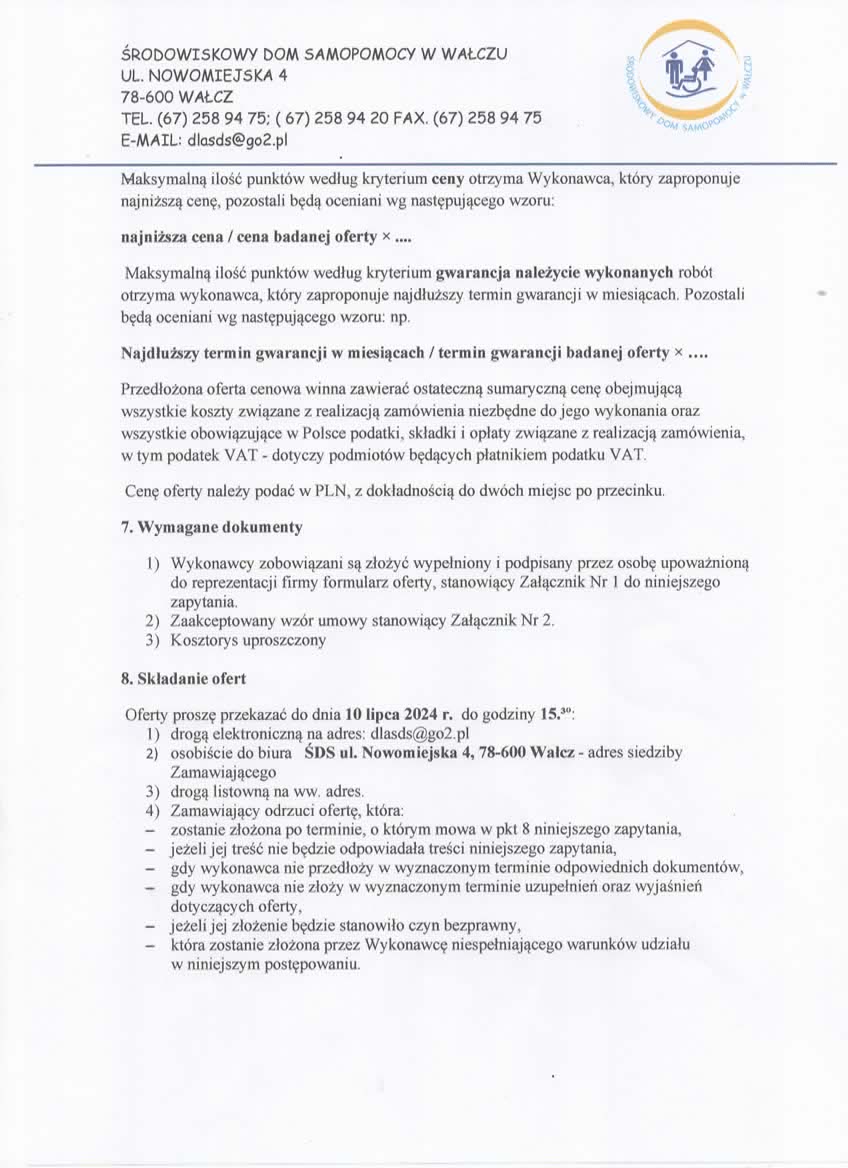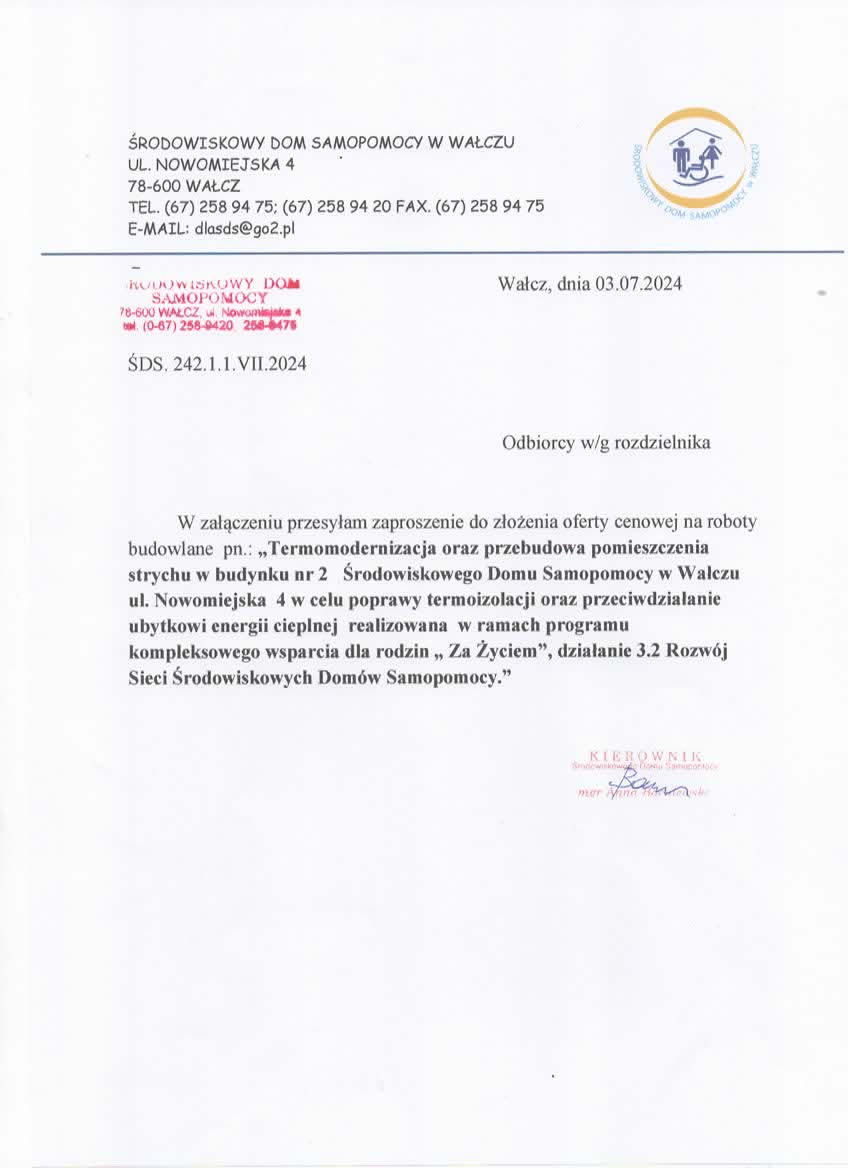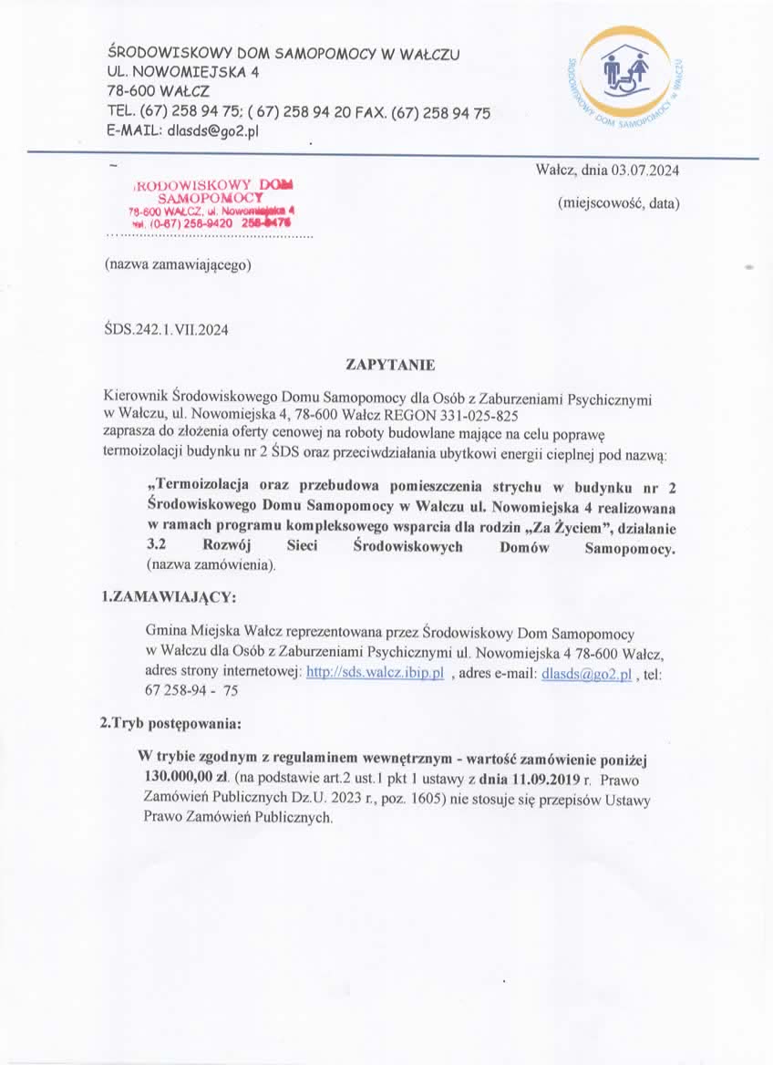 Pismo przewodnie Zapytanie ofertowe "Termoizolacja i przebudowa pomieszczenia strych budynku nr 1 ŚDS"
